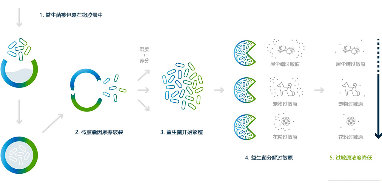 - 微胶囊通过睡眠时的身体摩擦缓慢激活,益生菌会随环境湿度自我繁殖并持续发挥作用,无需额外操作,为用户提供长期、省心的无敏睡眠保护,降低使用成本与维护精力